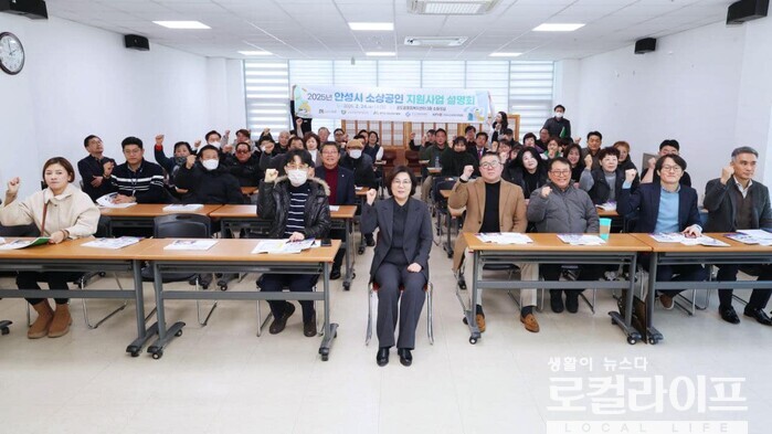 | ▲ 김보라 안성시장(맨 앞줄 왼쪽에서 세 번째)이 ‘2025년 안성시 소상공인 지원사업 설명회’에 참석해 기념촬영을 하고 있다. (사진출처=김보라 페이스북) |