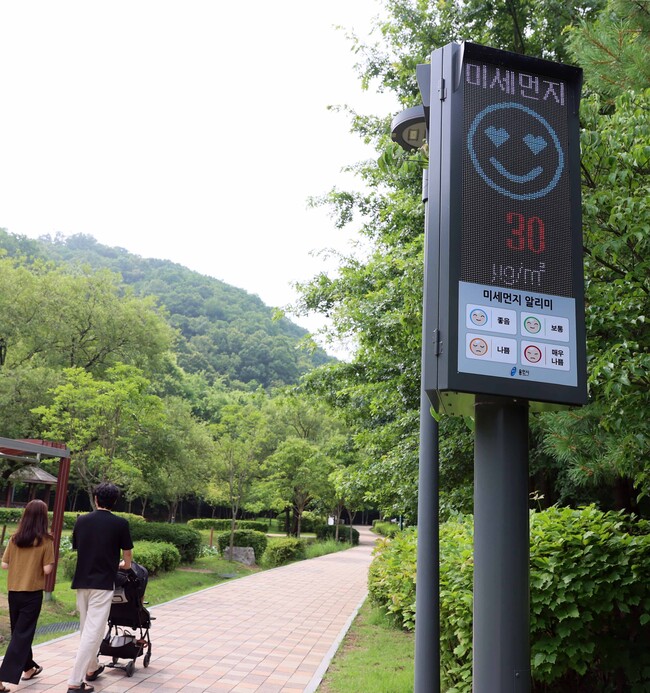 용인시는 13일 처인구 경안천변 산책로, 기흥구 서천레스피아, 수지구 풍덕천 별빛공원 등 유동 인구가 많은 공원 10곳에 미세먼지 신호등을 설치했다고 밝혔다.