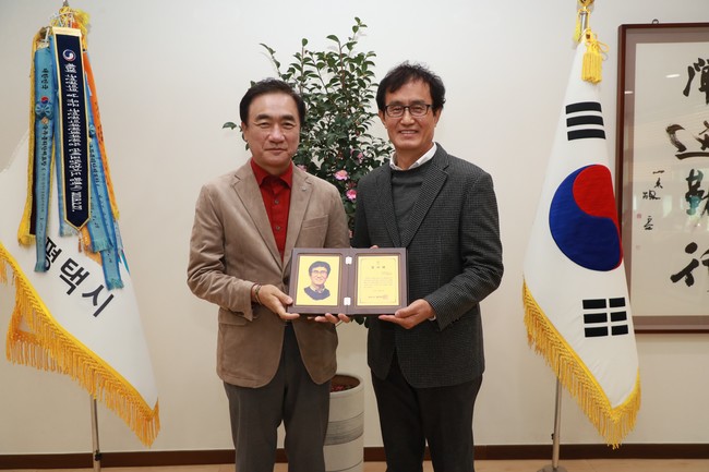 [로컬라이프] 평택시(시장 정장선)는 9일 시장집무실에서 「평택은 들이다」 작사자 최치선씨에게 감사패를 전달했다.