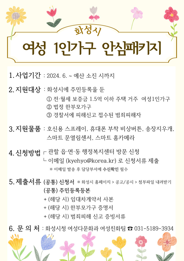 정명근 화성시장은 “안심패키지 지원이 여성1인가구 등 사회적 약자 대상 범죄 예방과 안전한 일상에 도움이 되길 바란다”고 말했다.