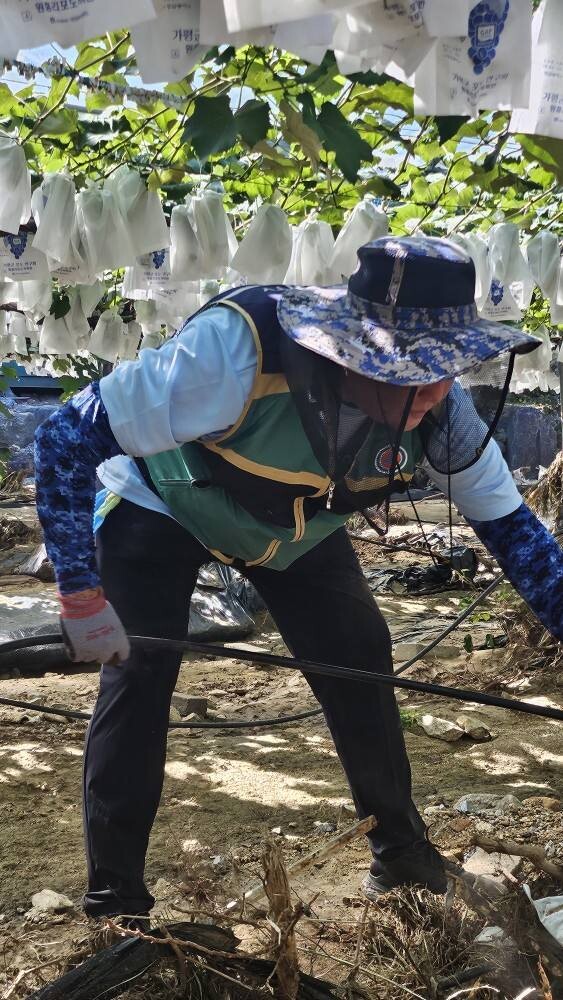 그러면서 가평의 수마가 휩쓸고 간 포도밭에 도착해, 진흙에 묻힌 비닐과 쓰레기와 잡목 등을 걷어내고 치우는 역할을 했다고 전했다.