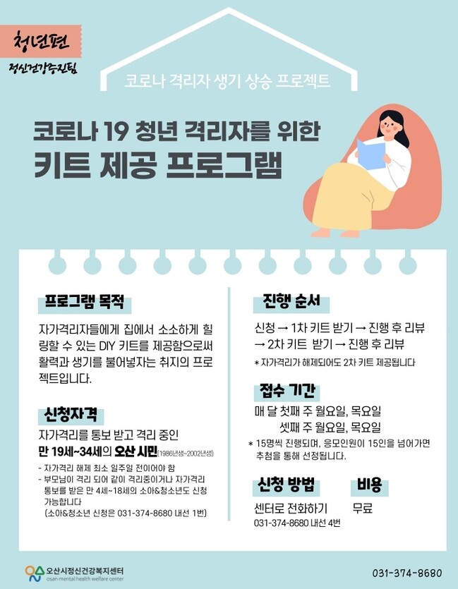 특히 4월부터는 자가격리 중인 아동.청소년과 청년을 대상으로 비대면 키트를 제공하는 프로그램을 새롭게 시작, 자가 격리로 우울과 불안, 답답함 등 심리적 어려움을 겪고 있는 오산시민의 마음 건강을 돕기 위해 공예, 밀키트 등을 활용하여 비대면으로 진행된다.