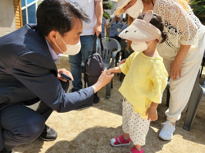 사진/하은호 군포시장 당선인이 6월 12일 다문화가정 행사에 참석해 어린이와 악수를 나누고 있다.(사진제공=군포시)