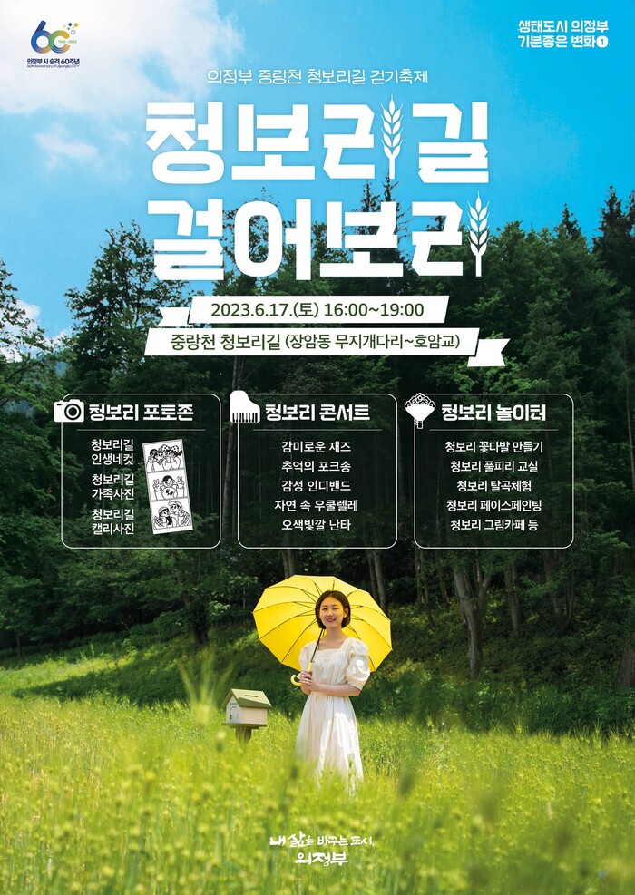 [로컬라이프] 송준형 기자 = 의정부시는 6월 17일 토요일 오후 4시부터 7시까지 중랑천 무지개다리에서 호암교 구간에 조성된 청보리길에서 <청보리길 걸어보리> 행사를 개최한다고 밝혔다.
