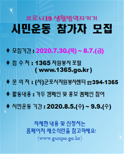 시는 이를 위해 8월 7일까지 군포시민(성인)을 대상으로 캠페인 참가자들을 모집한다. 참가신청은 1365 자원봉사 포털(www.1365.go.kr)에서 접수하며, 참가자는 자원봉사시간을 인정받을 수 있다.