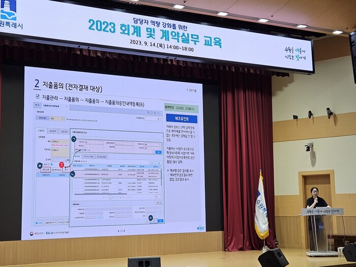 회계실무 교육을 한 지방재정운영지원단 소속 임수정 강사는 차세대 지방재정관리시스템을 이용한 이호조 지출 절차 방법 등을 사례 위주로 설명했다. 수원시 경리팀장이 세출예산 집행 기준 등 회계실무 지출 분야 교육을 했다.