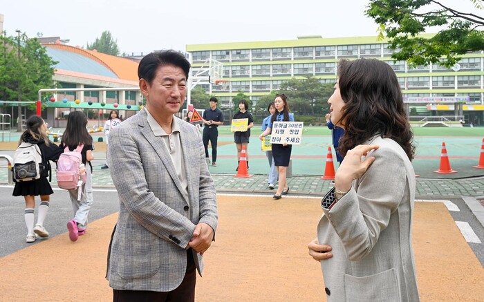 [의정부=로컬라이프] 송준형 기자 = 김동근 의정부시장은 23일, 가능초등학교에서 학생들 등굣길을 살펴보았다.