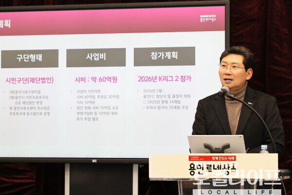 | ▲ 이상일 용인특례시장이 기자회견을 통해 시민축구단 '용인FC' 창단을 선언하며, 구체적인 계획에 대해 설명하고 있다. (사진제공=용인특례시) |
