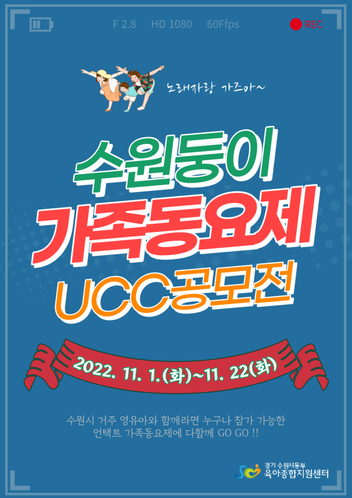 경기수원시동부육아종합지원센터가 22일 오후 11시까지 ‘제3회 수원둥이 가족동요제 UCC(동영상) 공모전’ 신청을 받는다.