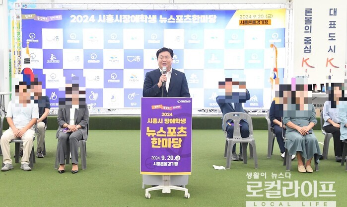 | ▲ 임병택 시흥시장이 ‘2024 시흥시 장애학생 뉴스포츠 한마당’ 행사에 참석하 축사를 하고 있다. (사진출처=임병택 페이스북) |