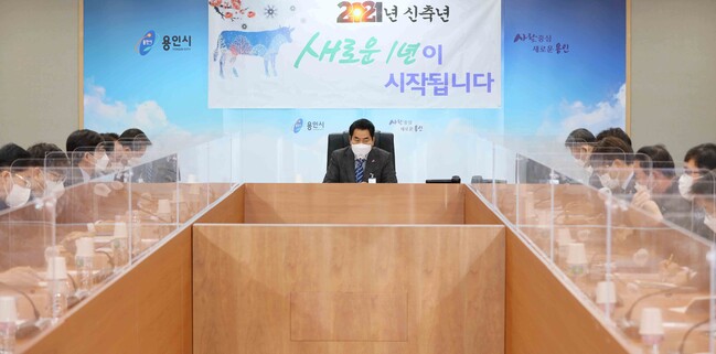 [로컬라이프] 용인시는 4일 시청 영상회의실에서 4급이상 간부 공무원과 35개 읍.면.동장이 영상회의 시스템을 활용해 시무식을 갖고 새해 업무를 시작했다고 밝혔다.