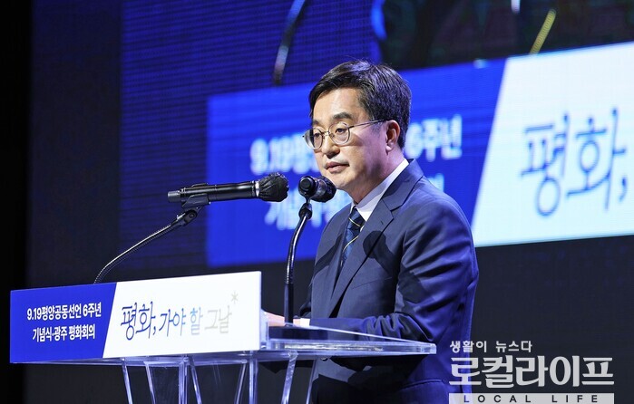 | ▲ 김동연 경기도지사가 ‘9·19 평양공동선언 6주년 기념식 및 광주평화회의’에 참석해 인사말을 하고 있다. (사진출처=김동연 페이스북) |