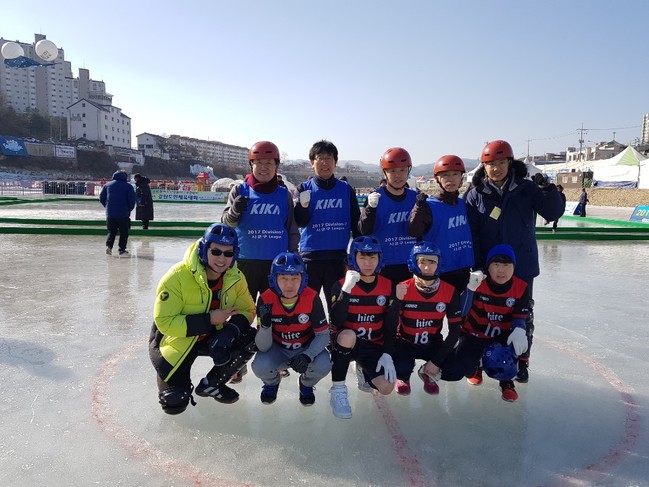 사진/ 얼음축구 결승전에 진출한 홍천군A팀과 하이트맥주팀, 서있는 (좌측, 첫번째) 허필홍 홍천군수
