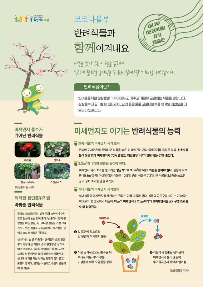 또 시민들이 반려식물과 교감하며 ‘코로나블루’를 해소하고, 기후위기 극복과 탄소중립에 한걸음 다가가기 위해 ‘코로나19 시대 희망을 심어요!’라는 제목의 내 나무 갖기 캠페인도 전개한다. 수원시청 홈페이지 시정소식란에 나무를 심는 시기와 방법, 반려식물 기르기의 효과 등을 알려주는 홍보자료가 게시돼 있어 시민 누구나 스스로 참여할 수 있다.