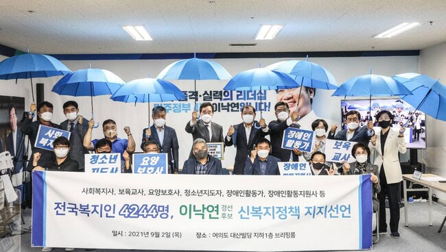 한편 이날 지지선언 행사에서는 우산이 비를 막아주듯 이낙연 후보의 신복지가 사회적 위기 및 복지 사각지대로부터 국민들과 사회복지인들에게 우산이 되어주길 바란다는 의미의 우산 퍼포먼스가 진행됐다.
