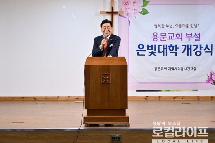 | ▲ 전진선 양평군수가 용문교회 부설 ‘2024년도 1학기 은빛대학’ 개강식에 참석해 축사를 하고 있다. (사진출처=전진선 페이스북) |