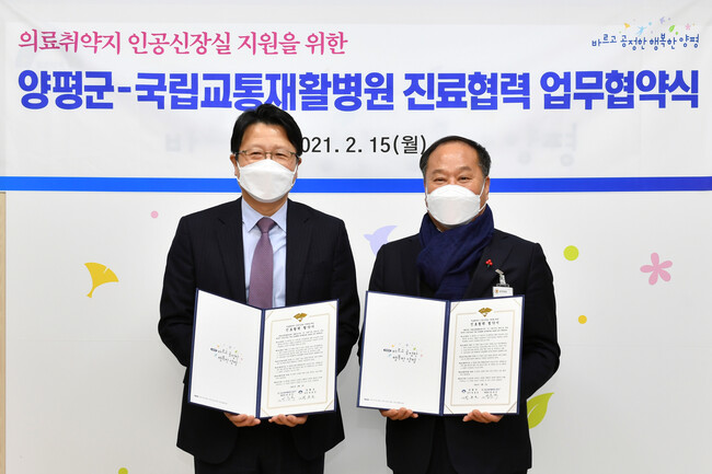양평군(군수 정동균)은 지난 15일 국립교통재활병원과 안전한 혈액투석 치료 환경 구축을 위한 “의료취약지 인공신장실 지원을 위한 진료협력 업무협약”을 체결했다.