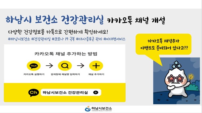 [로컬라이프] 하남시(시장 김상호)는 코로나19로 보건소 방문이 어려워진 시민들과의 건강 소통을 위해 이달부터 ‘하남시보건소 건강관리실’ 카카오톡 채널을 운영한다고 10일 밝혔다.
