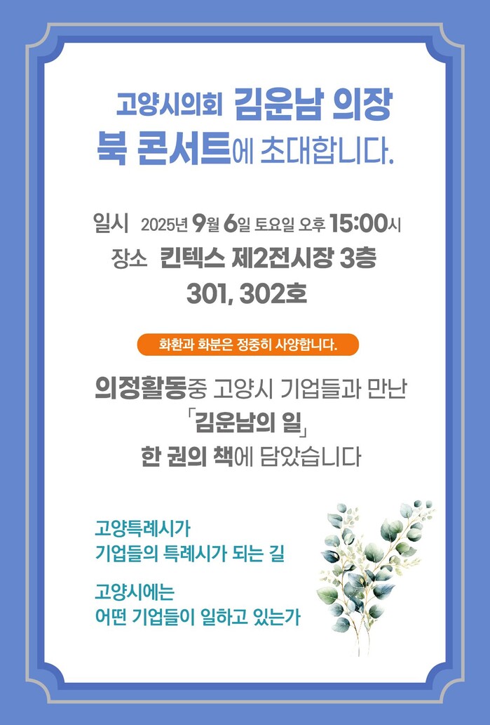 아울러 김 의장은 출판기념회 북 콘서트에 많은 관심 부탁드린다고 덧붙였다.