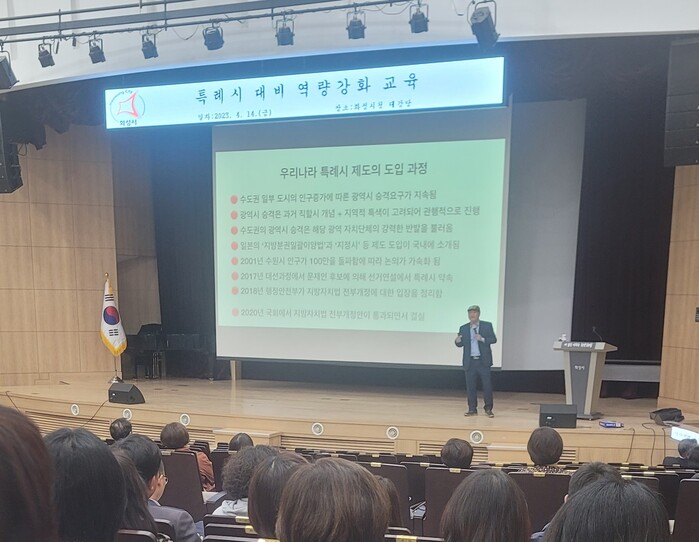 시청 대강당에서 진행된 이번 교육은 5급 이상 간부공무원 등 200여 명이 참석해 증가하는 행정수요에 대응하고 특례시에 걸맞는 행정 체계를 구축하고자 마련됐다.