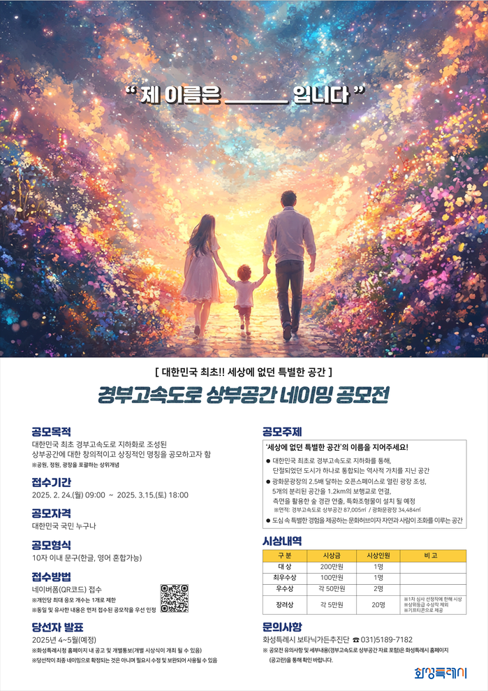 화성특례시(시장 정명근)가 대한민국 최초로 경부고속도로를 지하화해 조성된 상부공간에 대한 창의적이고 상징적인 명칭을 발굴하기 위해 ‘경부고속도로 상부공간 네이밍 공모전’을 진행한다고 24일 밝혔다.