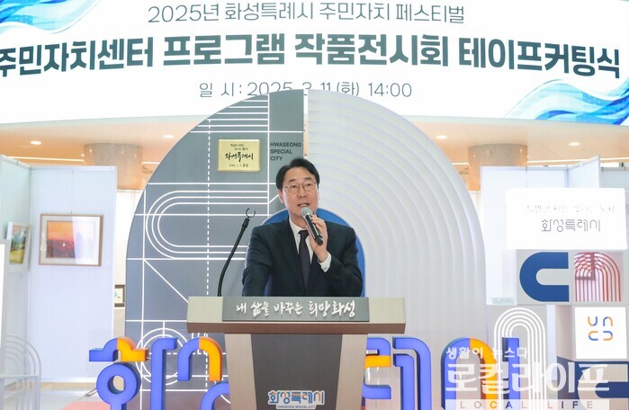 | ▲ 정명근 화성특례시장이 '2025년 화성특례시 주민자치 페스티벌 주민자치센터 프로그램 작품 전시회 테이프 커팅식'에 참석해 축사를 하고 있다. (사진출처=정명근 페이스북) |