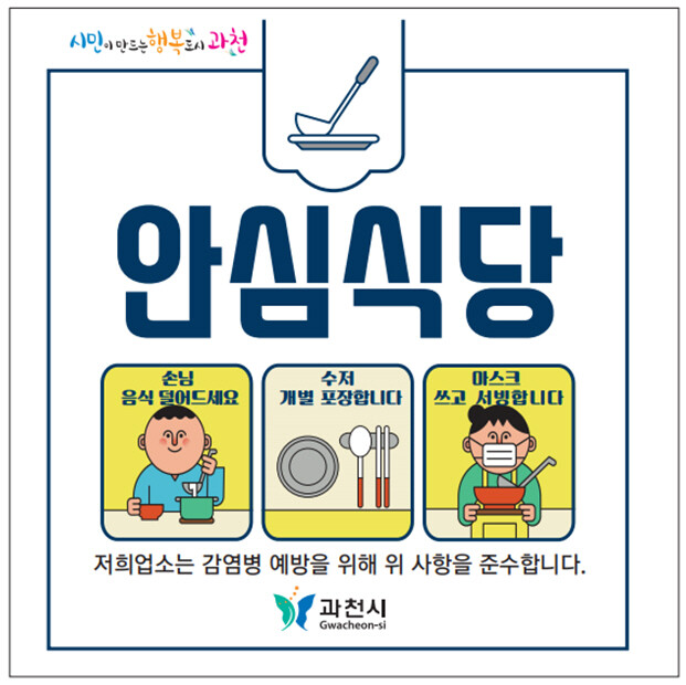 과천시는 △음식 덜어먹기 △위생적 수저 관리 △종사자 마스크 쓰기 △방역 수칙 준수 여부 등의 안심식당 지정 기준을 충족하는 관내 음식점을 안심식당으로 지정한다.