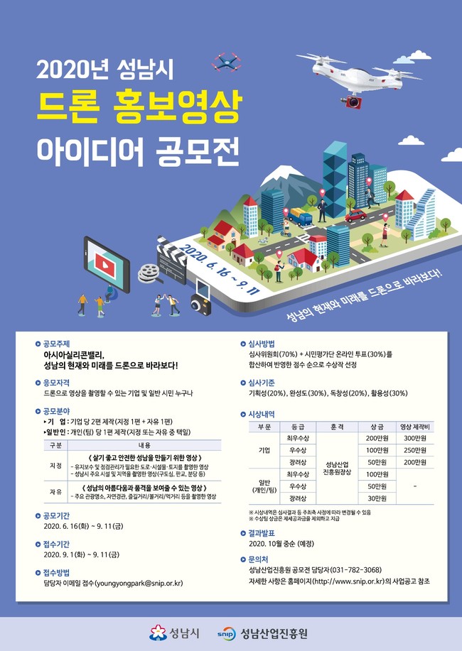 이번 공모전은 ‘아시아 실리콘밸리, 성남의 현재와 미래를 드론으로 바라보다!’라는 주제를 통해 성남시의 다양한 미래와 시민편의를 모색하고 이를 지역사회 홍보 활동에 활용하고자 기획되었다.