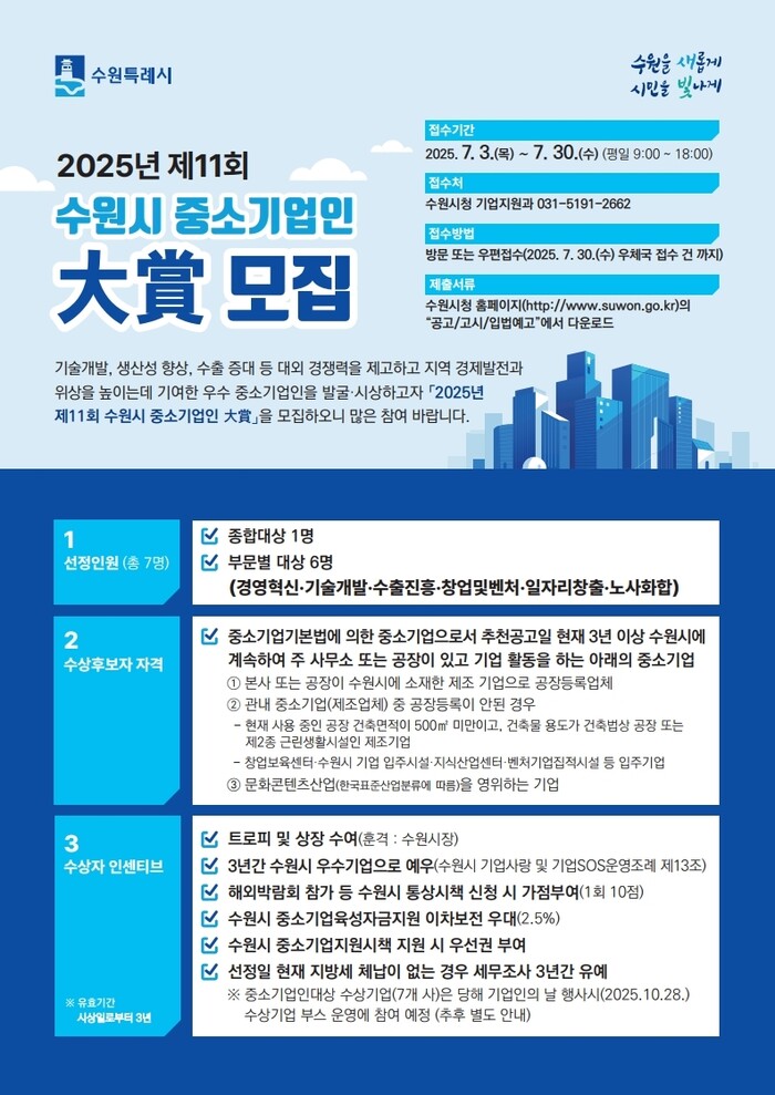 수원시(시장 이재준)가 ‘제11회 수원시 중소기업인 大賞(대상)’ 후보자를 7월 30일까지 모집한다.