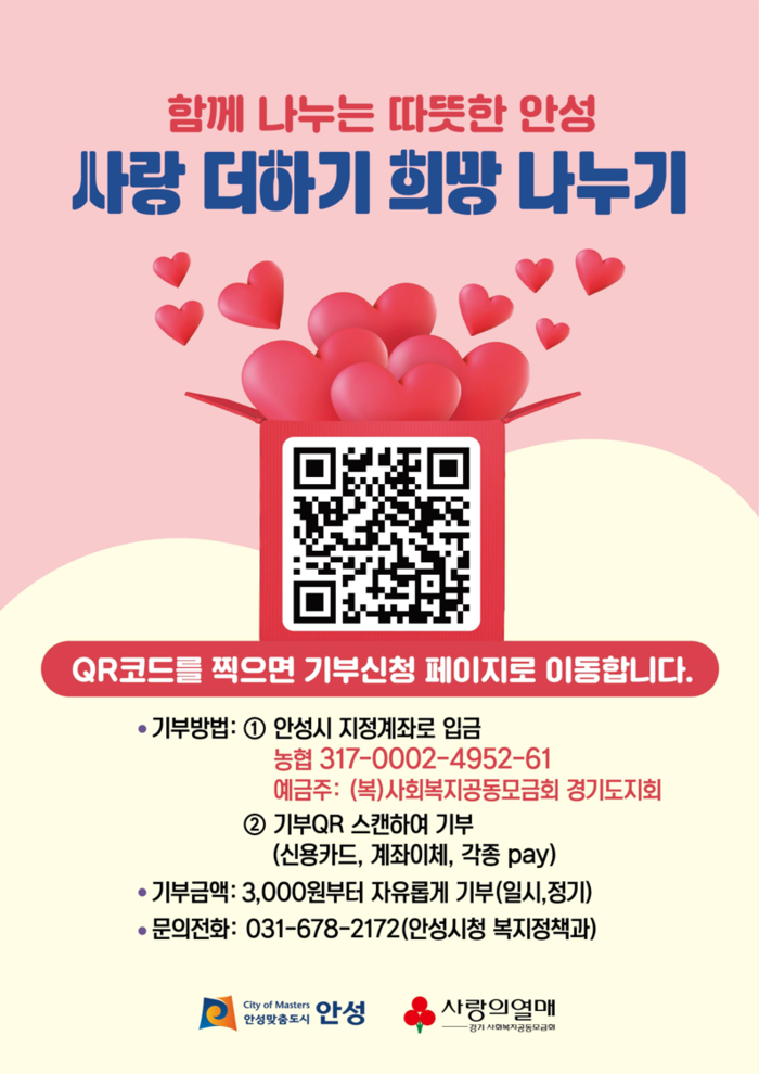 시 관계자는 “한 사람의 열 걸음보다 열 사람의 한걸음이 더욱 소중한 시대를 맞아 공동체를 향한 시민분들의 따스한 관심과 응원이 어느 때보다 절실하다”며 “올해도 더불어 사는 풍요로운 안성을 위해 ‘사랑더하기 희망나누기 지정기부금 모금캠페인’을 지속적으로 추진하겠다”고 밝혔다.
