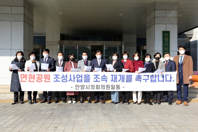 이에 과천공공주택사업 기간인 2025년 12월내에 연현공원 조성사업을 완료해야 하는 상황에서 안양시의회는 안양시와 경기도의 적극적 대처와 사업의 조속 재개를 촉구를 위해 김경숙 도시건설위원장의 대표발의로 안양시의원 21인의 전체 서명을 받아, ‘연현공원 조성사업 조속재개 촉구건의안’을 통과시켰으며, 본 사업이 원활히 추진될 수 있도록 집행부서에 촉구하는 시간을 가졌다.
