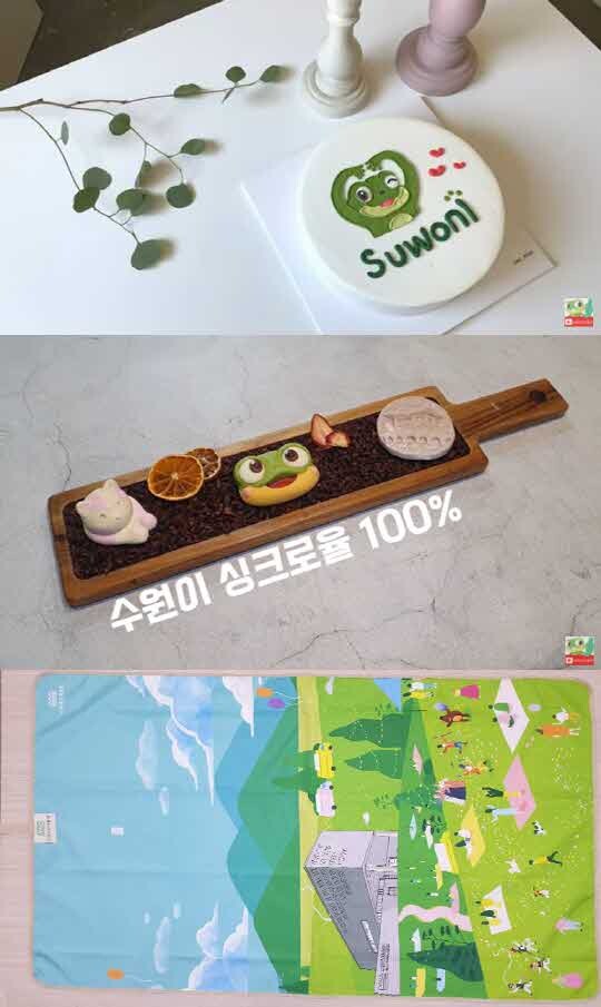 사진/ ‘수원광교박물관 개관 7주년 기념 이벤트’ 기념품(위쪽부터 수원이 케이크, 수원이 초콜릿, 돗자리) (사진제공=수원시)