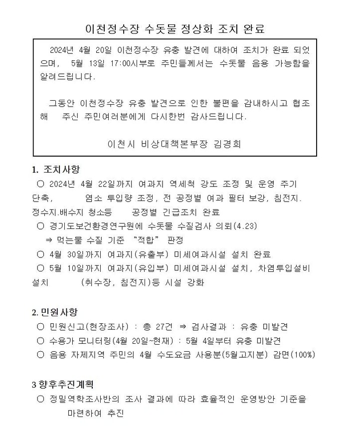아울러 그동안 이천 정수장 유충 발견으로 불편을 겪으신 분들 모두 감내하시고 기다려 주셔서 진심으로 감사드린다고 말했다.