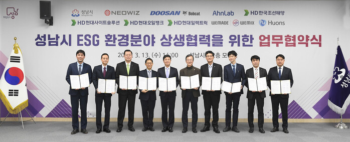 성남시는3월13일 오후2시 시청2층 모란관에서 지역 내9곳 기업과‘ESG환경분야 상생협력을 위한 업무협약’을 체결했다.