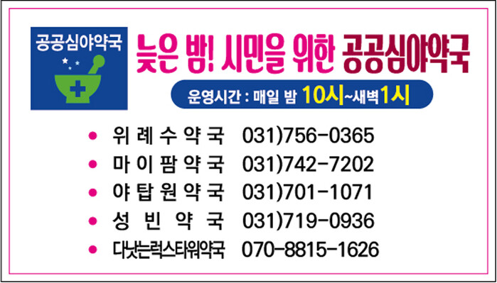 공공심야 약국은 ▲수정구 창곡동 위례수 약국(☎031-756-0365) ▲중원구 금광동 마이팜 약국(☎031-742-7202) ▲분당구 야탑동 야탑원 약국(☎031-701-1071) ▲분당구 삼평동 다 낫는 럭스타워 약국(☎070-8815-1626) ▲분당구 구미동 성빈 약국(☎031-719-0936)이다.