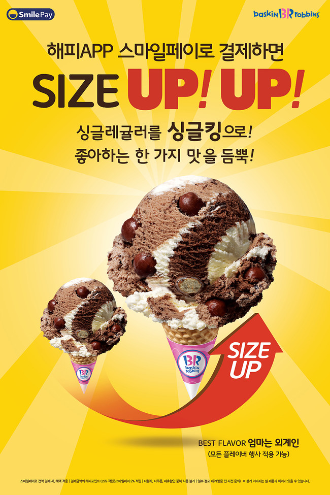 배스킨라빈스는 오는 30일까지 이베이코리아의 간편결제 서비스 스마일페이와 제휴해 ‘사이즈 업’ 프로모션을 진행한다고 밝혔다.