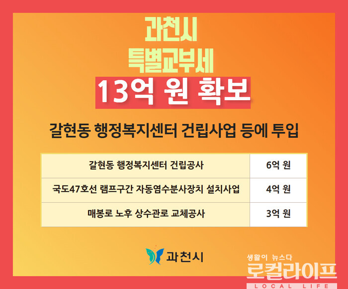 이와 관련해 신계용 과천시장은 18일, 자신의 페이스북을 통해 “과천시가 행정안전부로부터 특별교부세 13억 원을 확보했다”고 밝혔다.