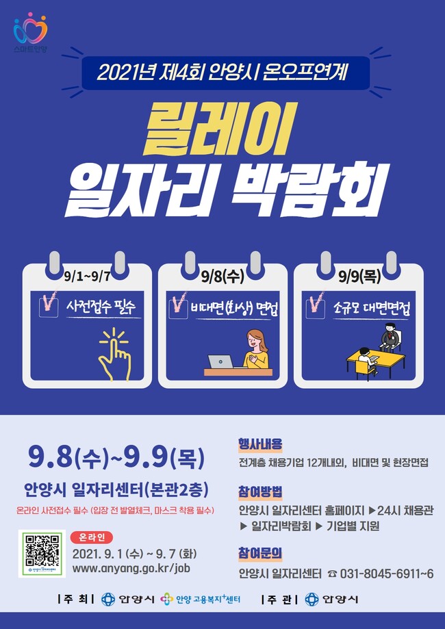 이번 일자리박람회는 12개 기업이 구인업체로 참여해 60여명을 채용할 계획이다. 참여를 희망하는 구직자는 안양시 일자리센터 홈페이지(anyang.go.kr/job)에서 9월 1일부터 7일까지 사전 참가신청이 필수다.