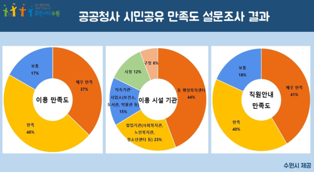 수원시가 8월 26일부터 9월 19일까지 수원시청 홈페이지(온라인)와 시·구·동 민원실에서 진행한 ‘공공청사 시민공유 만족도 설문조사’에서 응답자의 83%가 “시민공유 서비스에 전반적으로 만족한다”고 답했다.