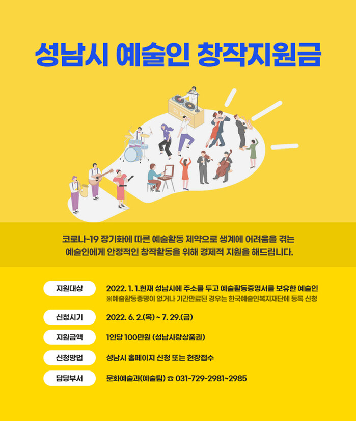 온라인 신청이 어려운 경우 지원신청서(성남시 홈페이지→일반공고), 예술활동증명서(예술인경력정보시스템=www.kawfartist.kr), 주민등록초본을 성남시청 6층 문화예술과에 직접 내면 된다.