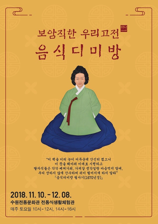 [수원=한국내츄럴타임즈] 강동일 기자 = 수원문화재단(대표이사 박흥식) 수원전통문화관에서 오는 11월과 12월에 걸쳐 단기 교육 프로그램 ‘보암직한 우리고전Ⅰ 음식디미방’을 선보인다.