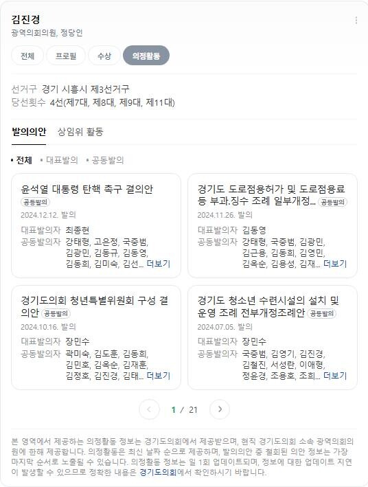 이어 이제부터는 네이버에서 의원 이름을 검색하시면 의안 발의 내역, 상임위 회의록 등 주요 의정활동 정보를 보다 쉽고 간편하게 확인하실 수 있다고 전했다.