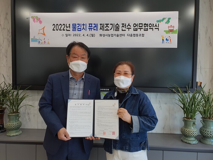 협약에 따라 앞으로 화성시농업기술센터는 다옴협동조합에 맞춘 표준화된 제조공정과 물김치 퓨레 제조 매뉴얼, 신제품 상품화 등을 지원할 방침이다.