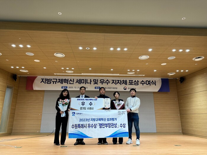 수원시가 행정안전부 주관 ‘2023년 지방규제혁신 성과평가’에서 행정안전부 장관상을 받았다. 시상식은 21일 서울상장회사회관 대강당에서 열렸다.