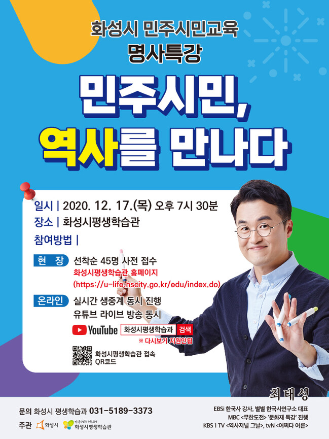 [로컬라이프] 화성시가 오는 17일 저녁 7시 30분 최태성 별별 한국사연구소 대표를 초청해 ‘민주시민, 역사를 만나다’를 주제로 온라인 특강을 개최한다.