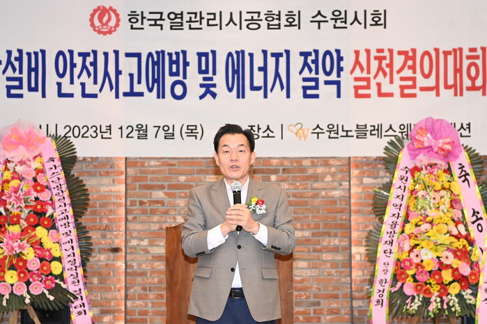 이재준 수원특례시장은 7일 노블레스 웨딩컨벤션에서 열린 ‘한국열관리시공협회 수원시회 가스·난방 설비 안전사고 예방 및 에너지절약 실천결의대회’에 참석해 “꾸준히 안전 캠페인, 봉사활동에 앞장서 주신 회원들에게 감사드린다”고 말했다.