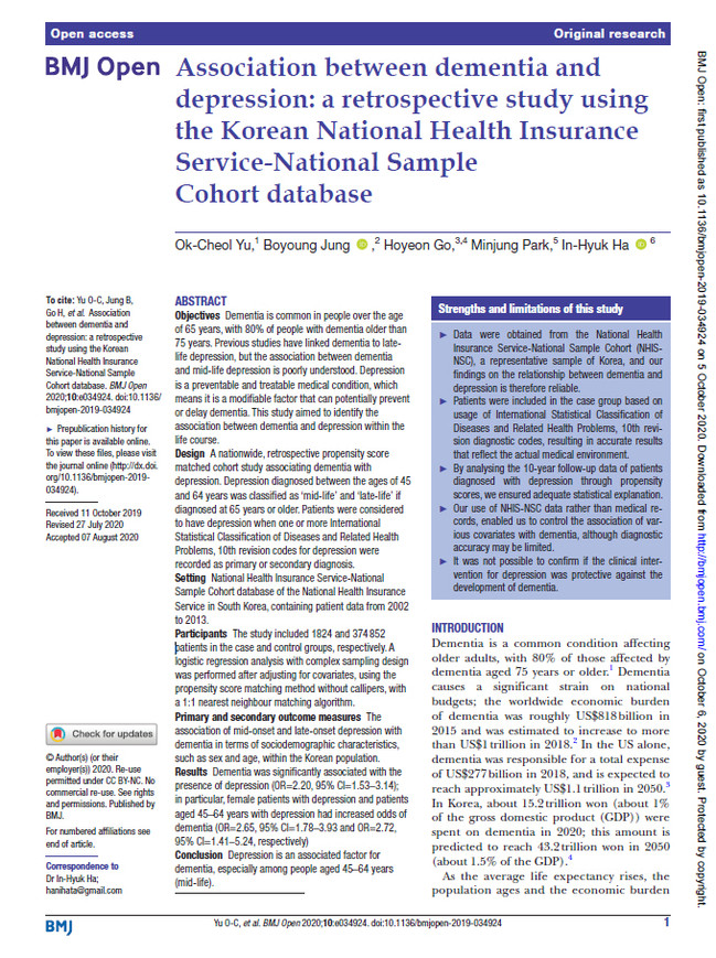연구팀은 국민건강보험공단의 2002~2013년 표본 코호트 (NHIS-NSC) DB를 사용해 2003년에 우울증을 진단받은 1,824명을 우울증군, 우울증을 진단받지 않은 37만4,852명을 대조군으로 선정했다. 이후 두 군에 대한 보다 정확한 분석을 위해 성향점수매칭(Propensity score-matching)을 진행해 우울증군과 대조군을 각각 1,824명으로 보정했으며, 로지스틱 회귀 분석을 통해 성별과 연령 등 한국인의 사회인구학적 특성과 우울증과 치매의 연관성을 분석했다.