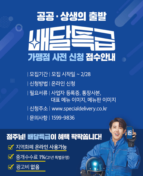 ‘배달특급’의 가맹점으로 가입을 원하는 업주는 홈페이지(https://www.specialdelivery.co.kr) 또는 포털사이트에서 ‘배달특급’을 검색 후 나오는 신청페이지에서 사업자등록증, 통장사본 이미지 파일을 첨부해 가입 신청을 하면 된다.
