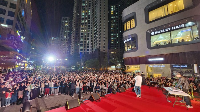 사진/지난 15일 하남시 미사역 문화의 거리에서 시민 3000여명이 모인 가운데 열린 ‘Stage 하남! 버스킹’ 오픈 특별공연에서 래퍼 ‘비오’가 ‘카운팅 스타'를 열창하며 관객의 뜨거운 함성을 받고 있다.(사진제공=하남시)