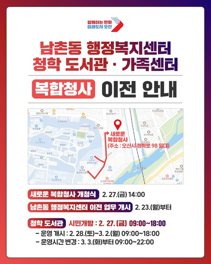 이와 관련해 이권재 오산시장은 3일, 자신의 페이스북을 통해 "노후한 건물과 불편한 환경으로 이용에 불편을 드렸던 남촌동 행정복지센터와 청학도서관이 이제 새로운 둥지로 이전한다"고 전했다.